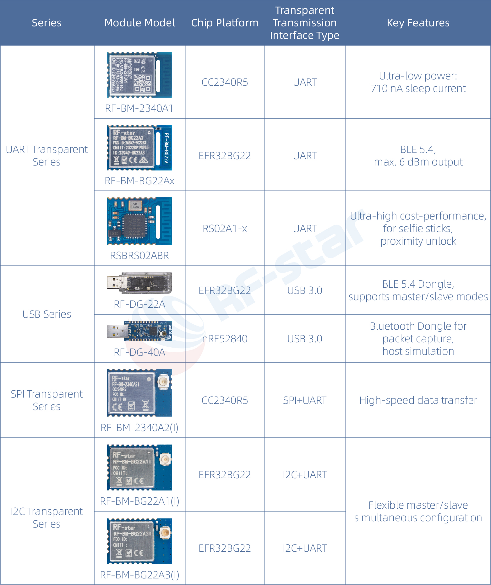 V. RF-star Şeffaf Bluetooth Modülü Seçim Tablosu